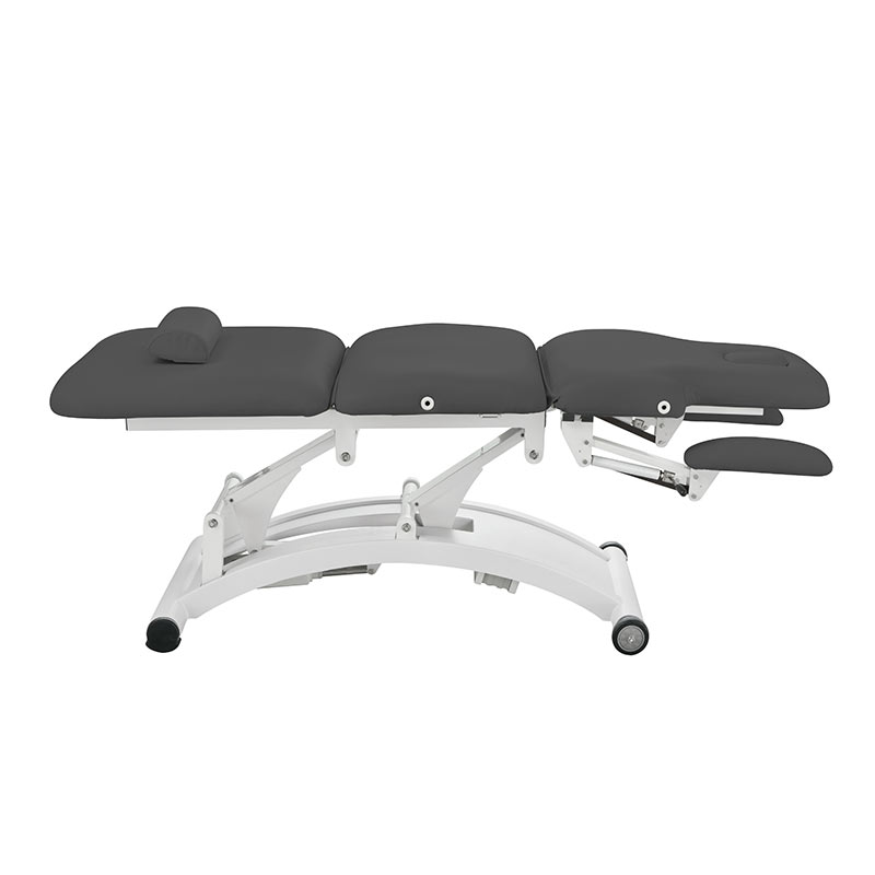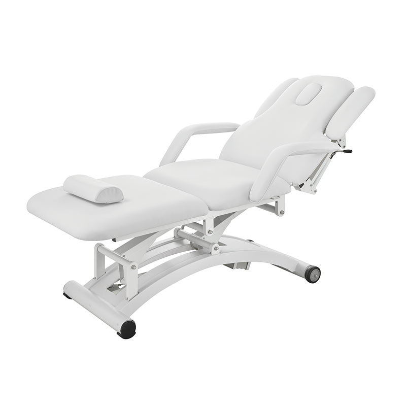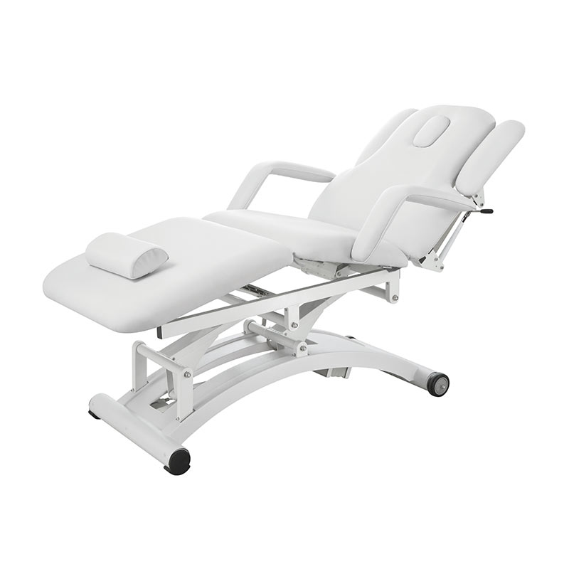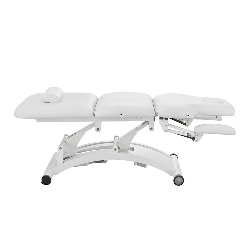 Eine hochwertige Liege, besonders geeignet für Physiotherapie. Mit drei Motoren, um alle Bewegungen zu steuern (Höhe, Rückenteil und Sitzneigung). Doppel-Armstützensystem, ausziehbar und regulierbar mittels Gasdruckfeder. Kopfstütze mit Gesichtsausschnitt und einem zusätzlichen Haltungskissen. Der Metallrahmen mit Rädern vereinfacht die Verschiebung. Hochwertige starke weiße PU-Polsterung, leicht abwaschbar.